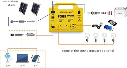 - 128 Wh, Max. AC Power 80 Watts, 1 Inverter 12V/110V AC, 3 USB Ports 5V, 4 DC Ports 12V. Perfect for outdoor activities or emergency power outage. Also support CPAPs, laptops, printers, coolers, lamps, smart phones, tablets, TVs, mini-compressors and others. If you want to increase the battery capacity to fully utilize the benefit of this mobile generator, you can connect another battery to the Gusto. For additional battery, please see below " Optional Accessories "